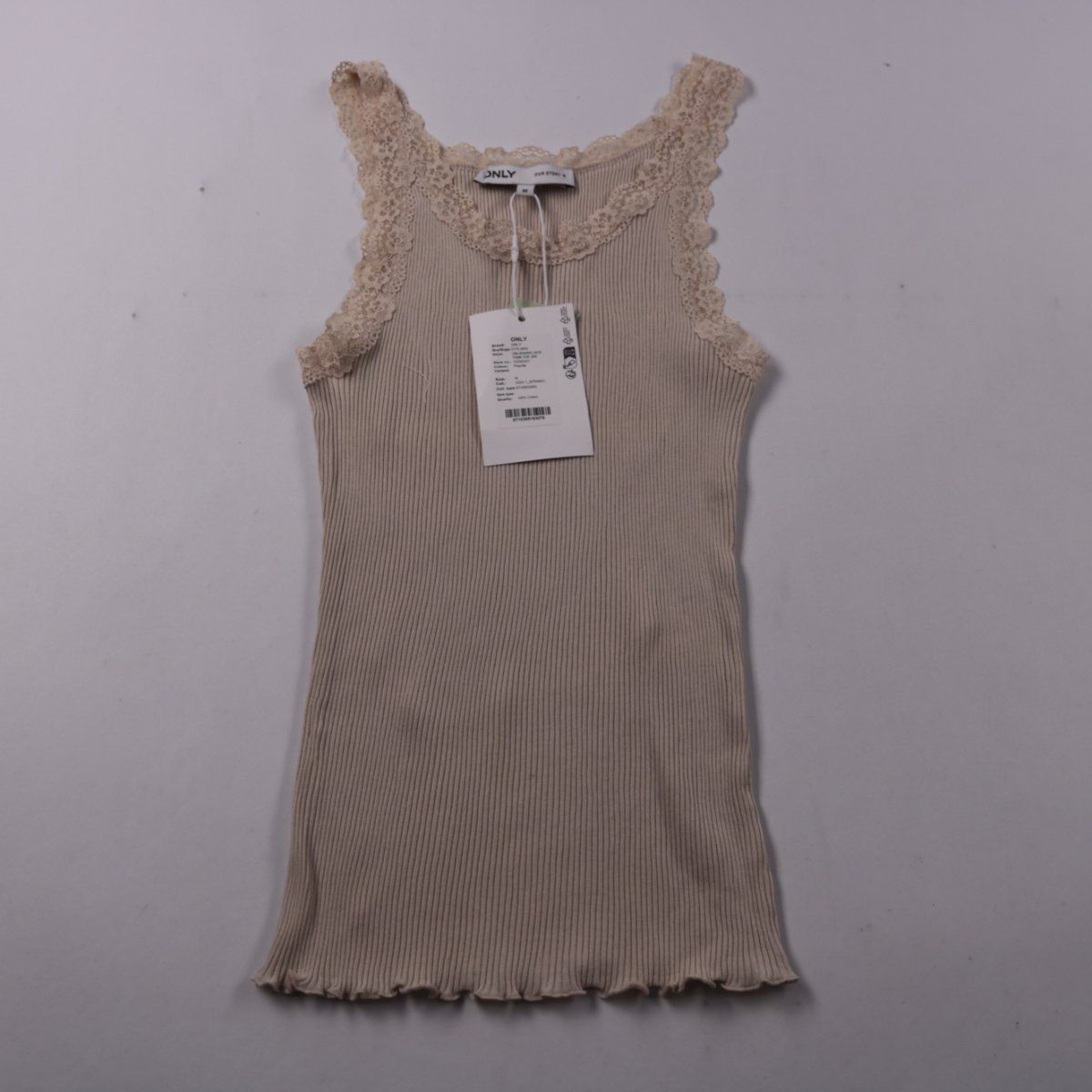 Майка ONLY в рубчик с кружевной отделкой по горловине и проймам, цвет Peyote. Подойдёт для летних образов и как базовый слой под жакет/кардиган. Хлопковый трикотаж хорошо тянется и комфортен в носке.