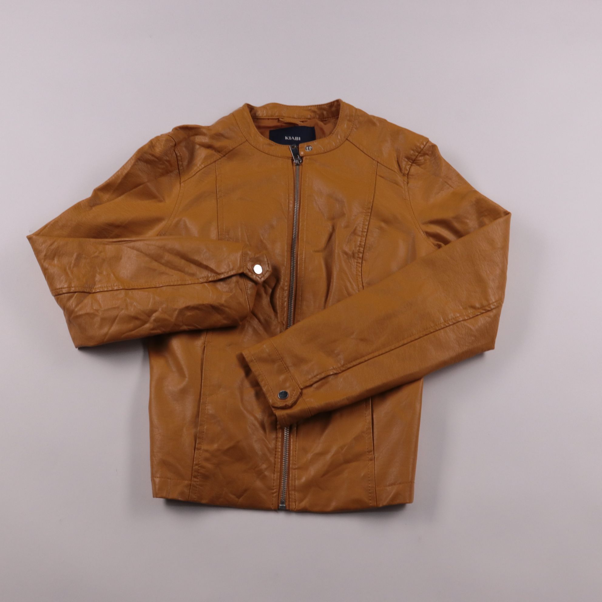 Женская куртка Kiabi из экокожи в рыжем (коньячном) цвете, на молнии и с воротником-стойкой. Подойдёт для повседневной носки в прохладную весну и осень, легко сочетается с джинсами и платьями. Практична тем, что не продувается и просто очищается влажно...
