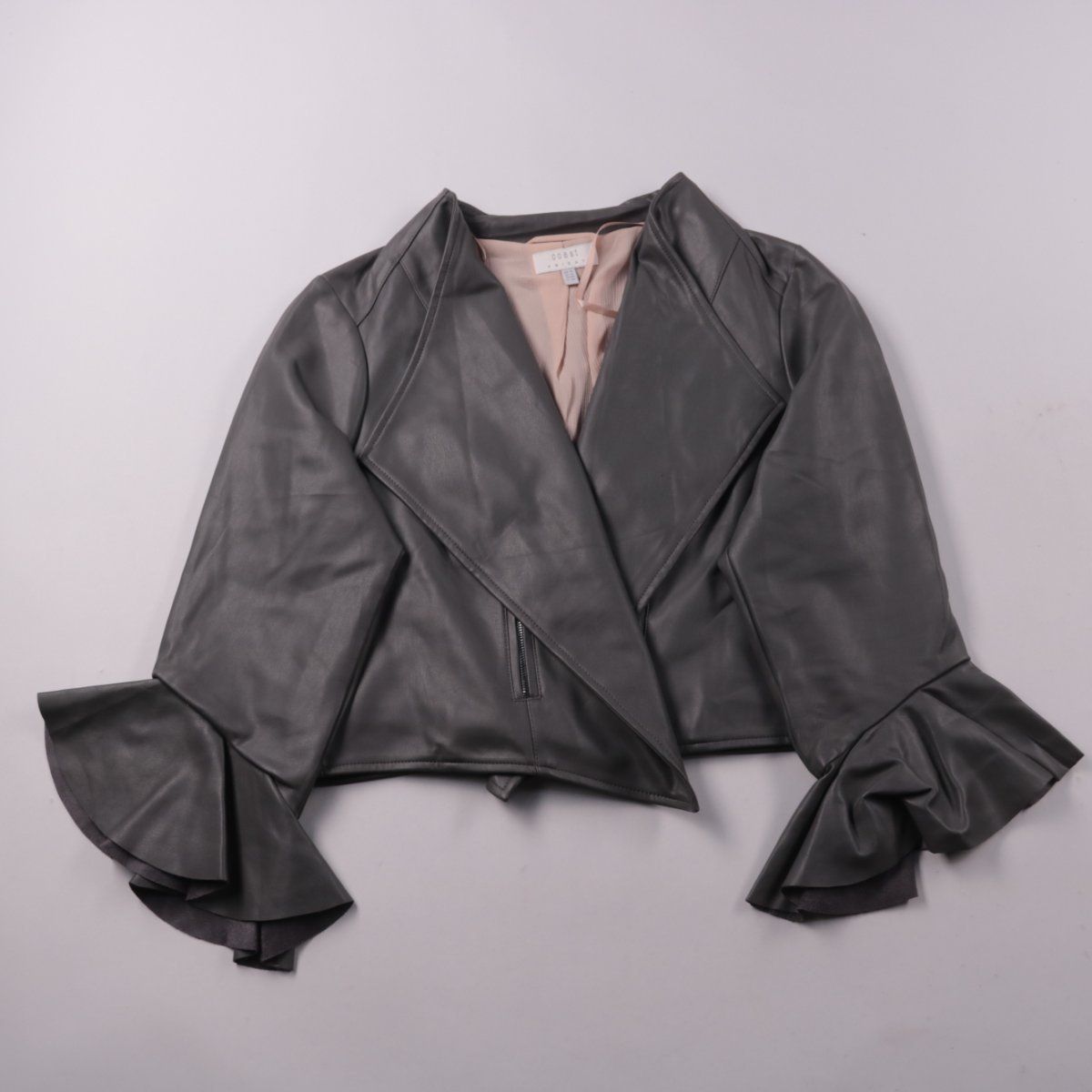 Укороченная куртка Coast из экокожи серого цвета с крупными лацканами и рукавами с воланами. Подойдёт для прохладной погоды и вечерних выходов, хорошо сочетается с платьями и брюками с высокой посадкой. Материал практичен в носке — поверхность легко протирать от загрязнений.