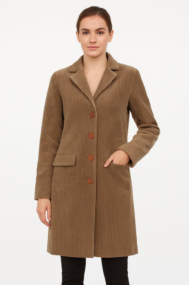 Женское демисезонное пальто Cry-Bird из фактурного вельвета в коричневом оттенке, на пуговицах и с карманами. Подойдёт для повседневных городских образов осенью и весной, хорошо сочетается с джинсами и брюками. Практичный материал: не маркий и держит ф...