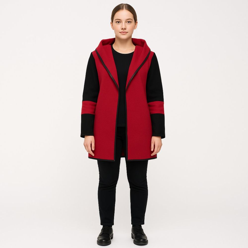 Женское пальто с капюшоном в красно-чёрной гамме, прямого кроя. Подойдёт для прохладной погоды осенью и весной и будет хорошо смотреться в повседневных образах. Шерсть в составе помогает сохранять тепло и держит форму.