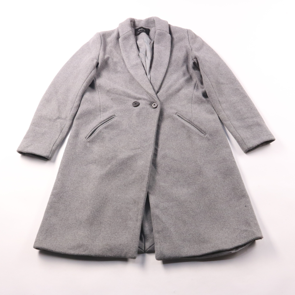 Женское пальто Stradivarius серого цвета, прямого кроя с лацканами и застёжкой на пуговицы. Подойдёт для повседневных образов в прохладную погоду и офиса, легко сочетается с джинсами и платьями. Практичный плюс — нейтральный оттенок и карманы по бокам.