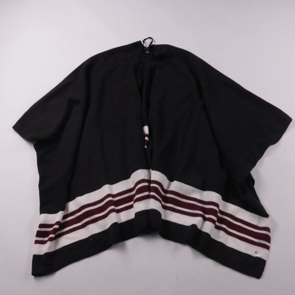 Пончо Atmosphere чёрного цвета с контрастными полосами по низу. Подойдёт для демисезонной погоды и многослойных образов поверх водолазки или свитера. Свободный крой не сковывает движения и удобно накидывается как на верхний слой.