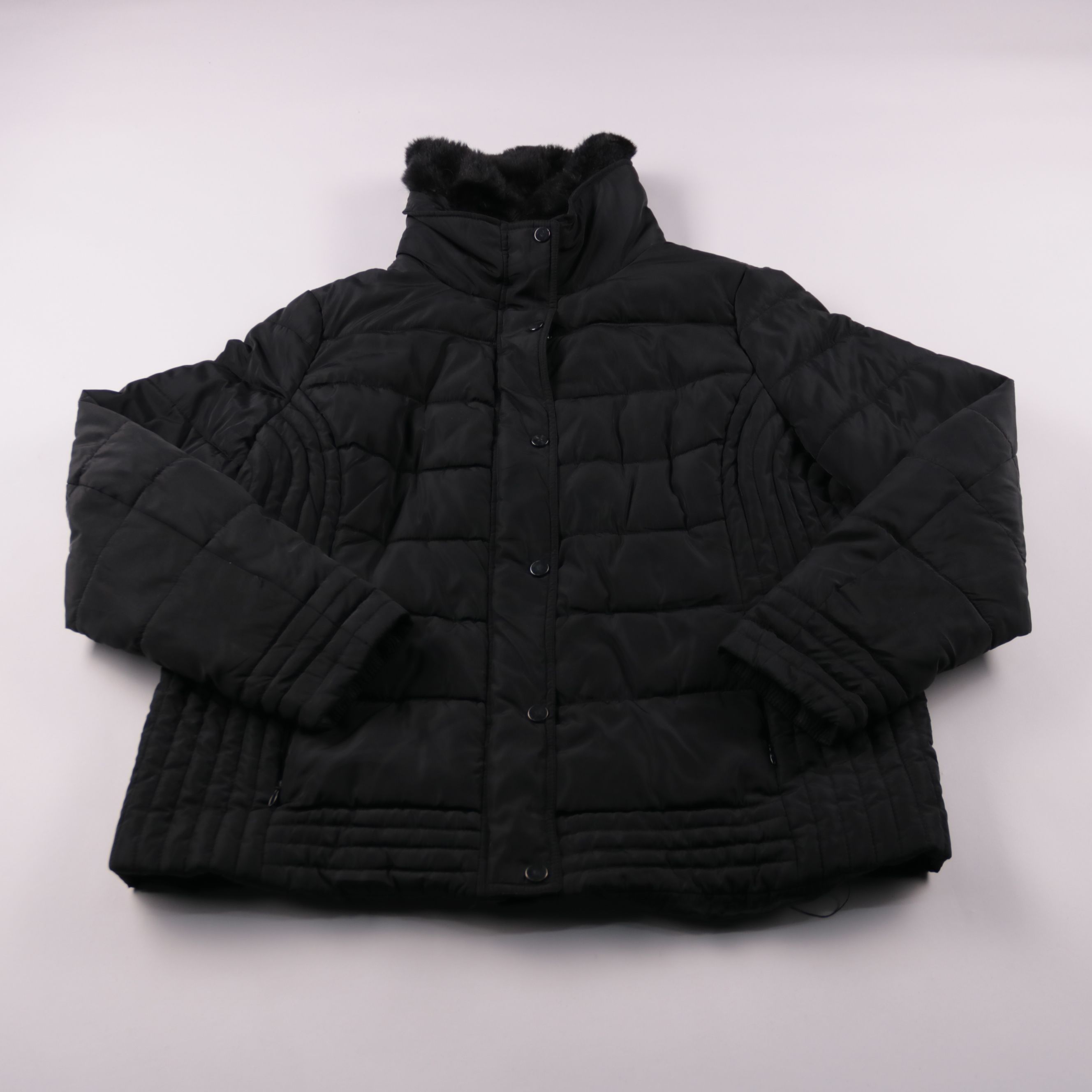Женская стёганая зимняя куртка Outerwear чёрного цвета с высоким воротником и меховой отделкой. Подойдёт для повседневной носки в холодную погоду, хорошо сочетается с джинсами и зимней обувью. Плотный утеплённый верх помогает сохранять тепло и защищает...