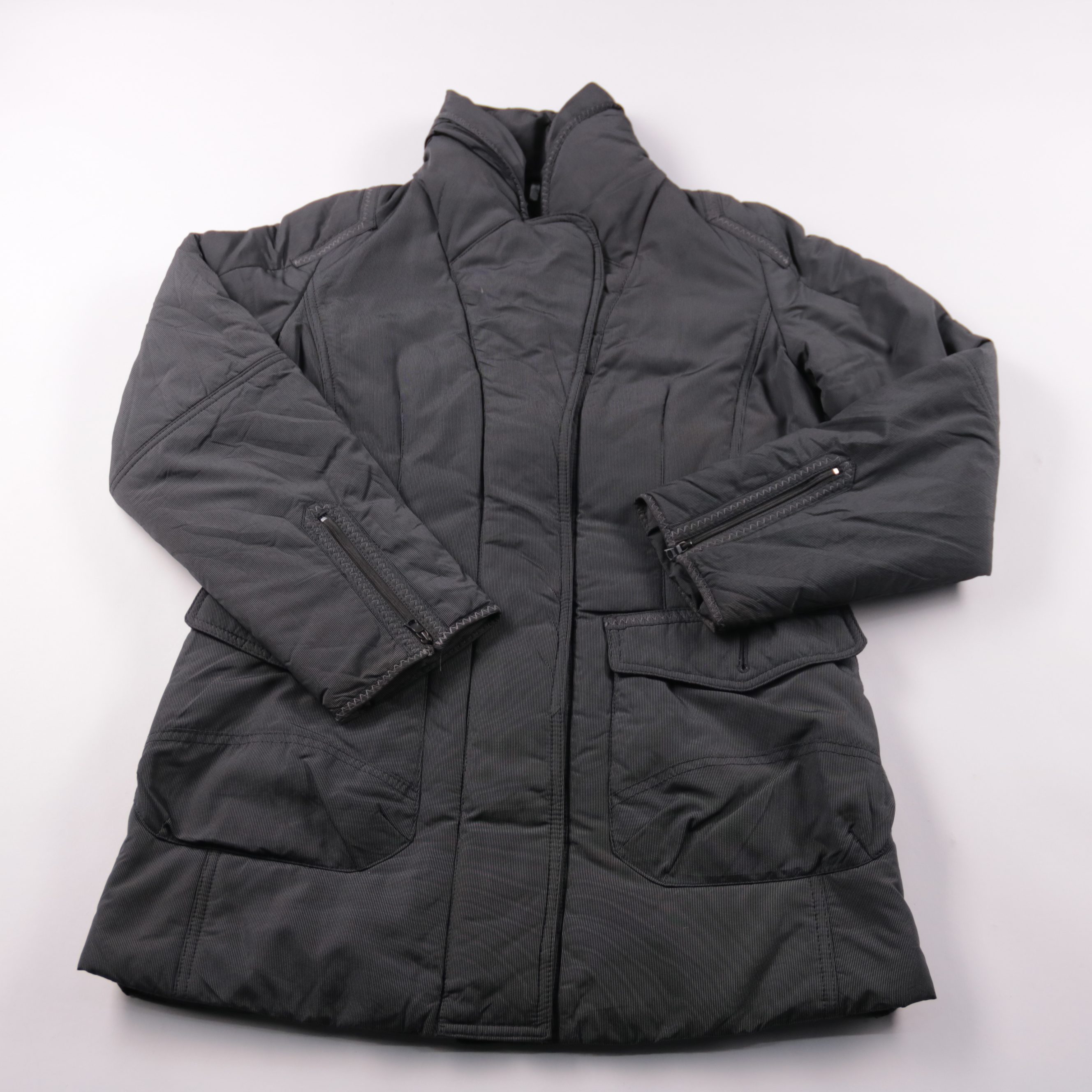 Зимняя стёганая куртка Bonita в тёмно-сером цвете с высоким воротником и застёжкой на молнию. Подойдёт для повседневной носки в холодную погоду, есть накладные карманы и молнии на рукавах. Практичная за счёт тёплой подкладки и утеплителя.