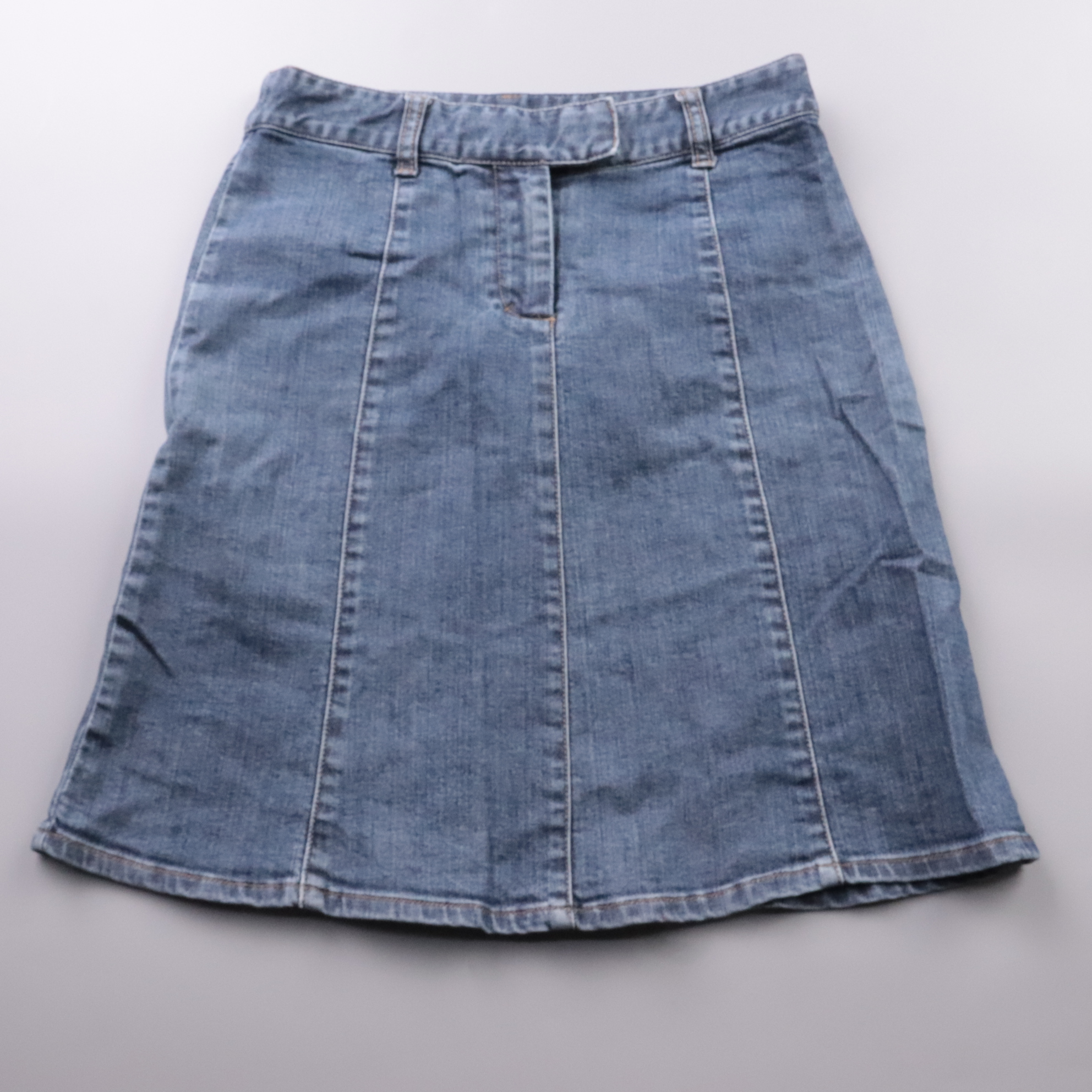 Джинсовая юбка H&M из синего денима А-силуэта с вертикальными швами и высокой посадкой. Подойдёт для повседневных образов в тёплый сезон и в межсезонье с колготками. Плотная ткань хорошо держит форму и удобна в носке.
