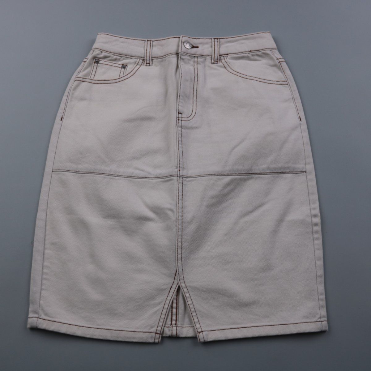 Юбка NA-KD молочного оттенка из плотного хлопка, с карманами и контрастной отстрочкой. Спереди есть разрез, поэтому в ней удобно ходить в повседневных образах. Материал держит форму и хорошо носится.